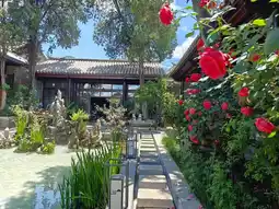 • Canopy of green, stolen moments: Look up to see the deep, rustic eaves framing a canvas of azure sky (Image 7). Ancient trees, lush and vibrant, glow under the sunlight with layers of radiant green leaves (Images 7, 8). Beneath the trees, wicker chairs in shaded corridors (Image 6) invite you to sit, sip tea, read, listen to the wind, and watch clouds drift by. Here, time flows gently, offering a stolen moment of tranquility.