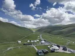 Winding roads, like silver ribbons, weave through the sea of grass, guiding explorers on their journey. White tents, scattered like pearls, bring a hint of human presence to this secluded haven. Most captivating are the horseback travelers, their figures so small against the grandeur of the scenery, yet perfectly harmonized with the majestic landscape. The mountain breeze carries the crisp sound of horse bells, evoking echoes of ancient times along the Tea Horse Road.