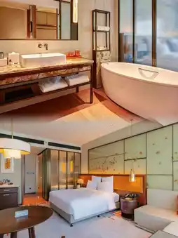 The moment you step into the hotel lobby, the artistic design and furnishings make you feel like you are in an art gallery. Strolling along the hotel corridors and spiral staircases, every moment seems like a set of art works. Su Shi's poems are split into Chinese characters and then designed into pendants. The art wall is inspired by the prototype of the sparkling surface of Huizhou West Lake. You may be amazed everywhere here.