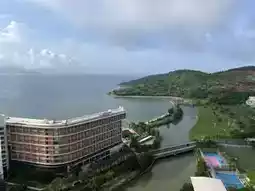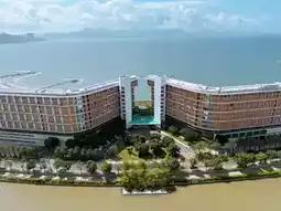 In the early morning, the sun penetrates the iconic curved glass curtain wall of the Le Meridien Hotel, making the orange and white twin towers shine brightly. Looking down from the rooftop infinity pool, the calm sea and the misty mountains in the distance form a natural picture, and the curved building design is like opening its arms to embrace the entire sea. In the evening, the warm yellow lights outline the outline of the building, and the hotel logo shines like a star in the night sky, contrasting with the reflection on the sea.