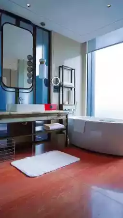 ☁️ The hotel is located in the Kaisa Center, the tallest building in Huizhou. The middle floors are offices, and the upper floors are the hotel. Since it occupies the pinnacle of Huizhou, my friend and I naturally chose to stay in the 270-degree deluxe river view room. The room is quite spacious with an excellent view. Both the bed and bathtub face the large floor-to-ceiling windows, immersing you in an urban elite vibe🍷🍷🍷