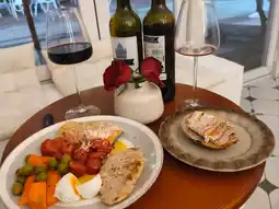 The Wine Selection: The cafe offers a variety of wines, including both Montalto Pinot Grigio and Sonovino red wines. The setting, with two wine bottles and full glasses on the table, suggests this is an ideal place for an intimate, light wine and tapas/light dinner date.