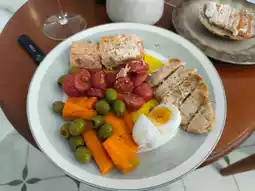 The Main Plate: This dish looks fantastic. It features generous portions of salmon & chicken, roasted tomatoes, tender-crisp carrots, and a good scattering of olives, all served alongside a perfectly cooked soft-boiled or poached egg. This is a fresh, nutritious, and appealing Mediterranean-style meal that pairs wonderfully with wine.