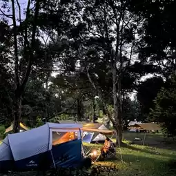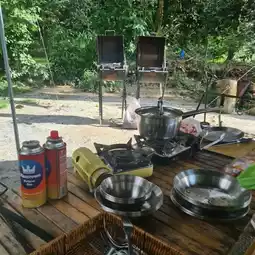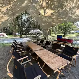Picture yourself arriving at this enchanted camping site, where time seems to slow down, and worries are carried away by the meandering river's current. The air is perfumed with the earthy aroma of the forest, and the sunlight filters through the foliage, creating dappled patterns on the forest floor. As you step onto the grounds, you'll find hammocks swaying like dreams between trees, inviting you to rest and unravel the stories whispered by the river's ripples.