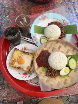A cool unique breakfast spot! Dine in here at Kopi and Benang for a unique kampung vibe ambience, classic Malaysian menu such as Nasi Lemak, Roti Bakar, Kopi Jantan and many more!