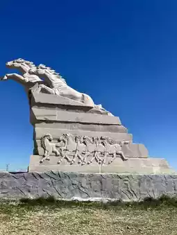 The road to Hulun Lake is filled with boundless grasslands. Clouds in the sky and white sheep and cattle on the ground dot the blue sky and green land, creating a sense of vastness and freedom. We headed to the Genghis Khan Horse Post at Hulun Lake. There's no entrance fee, and there's a rest stop along the way (see photo) where you can use the restroom. You can urinate here first, as there are no restrooms at the post.