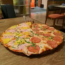 The pizza is crispy and fluffy, half of it is made of savory and spicy pepperoni, and the other half is Hawaii pizza made of pineapple and ham. It is sweet, fresh, salty and smooth, and each has its own unique taste.