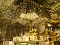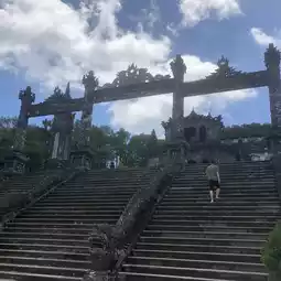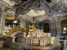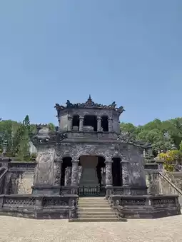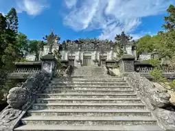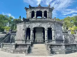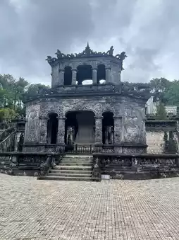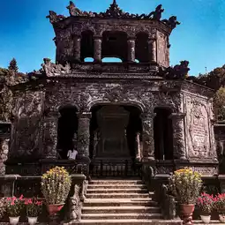 Discover the grandeur of Lăng Khải Định, the final resting place of Emperor Khai Dinh, nestled on Châu Chữ mountain near Huế, Vietnam. This architectural marvel, completed in 1931 after 11 years of meticulous construction, showcases a unique blend of Vietnamese and Western styles. The tomb’s exterior, with its imposing gray concrete and intricate dragon sculptures, contrasts beautifully with the vibrant, colorful mosaics inside. As you ascend the steps to Thien Dinh Palace, you’re greeted by stunning murals and a gilt bronze statue of the emperor himself. This UNESCO World Heritage Site is a testament to the emperor’s vision and the cultural fusion that defines this historical gem.