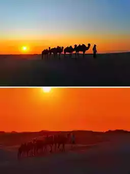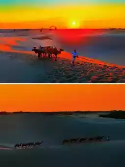 The 19:00* sunset is the desert's coronation 🌇! Camp on the western dunes of Yeming Sand to watch the sun dye camel caravans into molten silhouettes. Backlight pierces swirling dust, turning camel bell trails into threads stitching sky and earth.