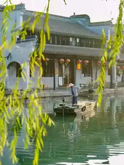With the willow trees on the shore and the ancient Jiangnan buildings, a mottled landscape painting of Jiangnan comes to your face