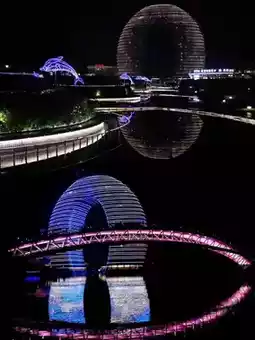 🌇In the evening, head to Moon Bay🌙The lights are on🏮The iconic lights emit a charming glow🌈Reflecting with the sparkling Taihu Lake🌊Stroll along the lake🚶Enjoy the beautiful night view🌃All the fatigue of the day disappears💯The romance of Huzhou is magnified infinitely at this moment💓💓💓