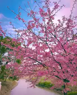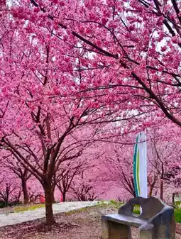 A vast expanse of cherry trees creates a sea of pink. When a gentle breeze blows, the falling petals create a dreamlike scene, perfect for taking photos and admiring the beauty.🌸