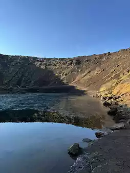 In the morning, we visited Kerið Crater Lake. The autumn weather was excellent, allowing us to see the entire crater lake, which would be frozen in winter. The crater lake was formed by a volcanic eruption 6,500 years ago and is 50 meters deep. The panoramic view from the top of the mountain is beautiful. Due to the minerals and water depth, the lake's color is a blue-green hue. You can walk around the top of the mountain or along the lakeside trail, making it a favorite spot for many photographers in Iceland.