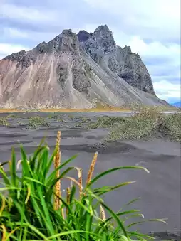Vestrahorn, often called “Batman Mountain,” is one of Iceland’s most dramatic and photogenic natural wonders, located on the Stokksnes Peninsula in southeast Iceland. Rising sharply from the black sand beach, its jagged peaks—reaching up to 454 meters—create a stunning contrast against the Atlantic Ocean and the endless sky. The mountain’s dark tones and unique shape make it a favorite among photographers, especially at sunrise or sunset, when the light paints the landscape in gold and pink hues. On calm days, the wet sand reflects the mountain perfectly, forming a mirror image that feels almost unreal. Nearby, dunes covered in grass sway in the coastal breeze, adding softness to the rugged scenery. The sound of waves and wind completes the peaceful yet powerful atmosphere. Vestrahorn embodies Iceland’s wild beauty—mystical, raw, and unforgettable.