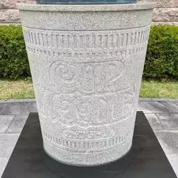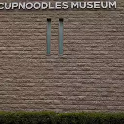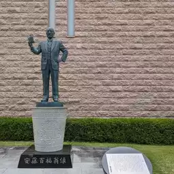 After walking for a while, a large building with tiled walls comes into view. In the middle of a large lawn is a bronze statue of Momofuku Ando, placed on top of a large cup of noodles.