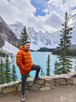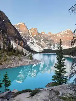 In the early morning, Moraine Lake is as still as a mirror, with its waters displaying an unreal turquoise hue. As sunlight gently touches the surface, the colors gradually brighten. Standing on the viewpoint rock, the reflection of the mountains on the lake creates a flawless landscape painting.
