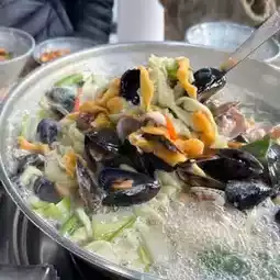 They say it's handmade noodles made with paprika and barley sprouts:)! It's clam kalguksu, but it also has a lot of mussels, so it feels like eating seafood kalguksu🤍 The amount is generous for the price, and the soup is refreshingly delicious, so I kept eating it
