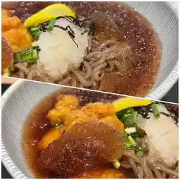 The noodles are softer and less chewy than soba, and are served in a crunchy soup flavored with dried sardine stock, similar to what is called "bukkake" soba in Japan. The soup has a sweet and gentle flavor.