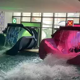 Indoor swimming pool, outdoor swimming pool where you can see airplanes, slides,