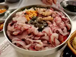 This is a great raw fish restaurant that I highly recommend to those who love seafood. I ordered the Hwangje raw fish restaurant with a lot of seafood. It's a huge portion for 3-4 people! Isn't the visual amazing...? The seafood is really fresh. My mom and grandma, who are picky eaters, kept saying it was delicious, so I was so happy :)