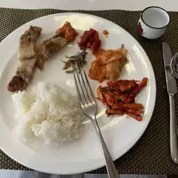 The breakfast here includes kimchi + pork belly + soju in the morning