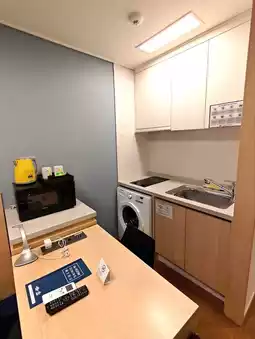 The area around Yunxi Station seems to be designed for the large number of transfer passengers. There are not only many hotels, but also convenience stores, restaurants and cafes. There are two brand hotels in the same building, the Wyndham Howard Johnson on the right and the Wyndham Days Inn & Suites on the left. The room rate at the Days Inn & Suites is relatively cheap, but passengers at the Howard Johnson can take the airport shuttle bus for free. For a one-night stay, I chose a suite hotel. The lobby is the same. This time I stayed on the 7th floor. The corridor is spacious. In addition to the bed and TV, the room also has simple kitchen equipment and kitchenware, a microwave and a washing machine. Because of the kitchen and washing machine, the space feels a bit crowded, but it is surprisingly clean. The bathroom does not have a bathtub but has a bidet. It is also very clean and has no odor. The hot water in the shower is also very strong. Only shower gel and shampoo are provided. The beds are clean and comfortable to sleep in. There are hundreds of TV stations to choose from so it's not boring at all. There are many restaurants, convenience stores, Burger King and OLIVE YOUNG around the hotel. If you have enough time during your transfer, it is recommended that you enter Korea and stay overnight at Unseo Station to eat some authentic Korean food.
