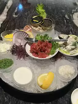 I had the caviar set. Starting with two glasses of Bollinger as an aperitif, the caviar plate with chopped salad, tuna, and crab meat. For the main course, sirloin steak with asparagus onion mashed potatoes!