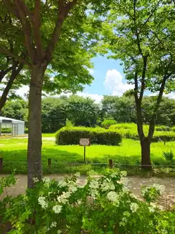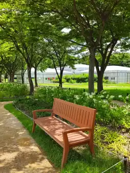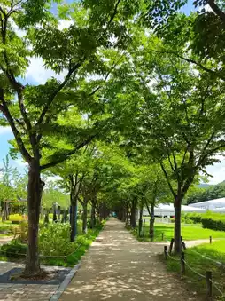 The forest trail area of Incheon Grand Park is a quiet path that runs along the edge of the park, and is designed to be a good place to take a leisurely walk along the forest. The sunlight shines softly through the trees.