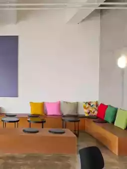The tables are spaced widely apart, providing a private space for quiet sitting. Sitting by the window allows sunlight to gently diffuse the floor, creating a warm, inviting atmosphere.
