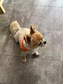 The cafe's mascot, the dog "Squirrel," greeted us at the entrance. 🐶
