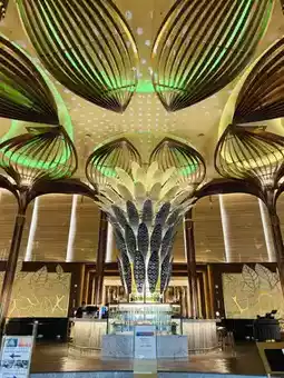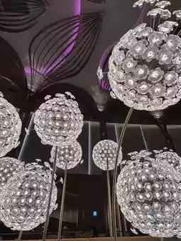 The unique lighting hanging from the ceiling, resembling bouquets of flowers, was striking, and the entire lounge was unified with a sophisticated design.