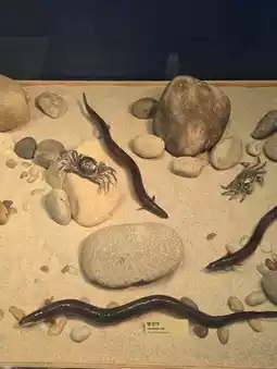 This exhibition at the Natural History Museum offers a comprehensive view of nature's ecosystem, showcasing the diverse organisms inhabiting the rivers and coastal areas of Ganghwa. The freshwater section features familiar creatures like minnows, crucian carp, and crayfish, while the tidal flat section is home to clams, crabs, and fiddler crabs, exuding the essence of the sea. Particularly notable is the display replicating a cross-section of a tidal flat, which helps children easily grasp the structure of the ecosystem. The lifelike models of creatures moving through the mud captivate visitors with their realism. Additionally, the exhibition provides detailed information about each organism's habitat and food chain relationships, enhancing educational interest. This display, which allows visitors to experience the diversity and harmony of nature firsthand, is a popular attraction for families.