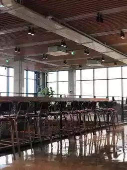 With sunlight streaming in through the large windows,