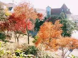 The Incheon Landing Operation Memorial Hall is not only a solemn witness to history but is also surrounded by a picturesque landscape. On the outdoor terrace, tall flagpoles fly the flags of the United Nations forces, rippling in the wind. From this vantage point, the autumn hillsides blaze with brilliant maple leaves, interwoven in vibrant shades of red, orange, and yellow. In the distance, European-style buildings are visible, while nearby, a rustic waterwheel nestles among scattered rocks, adding a tranquil and beautiful autumn ambiance to the memorial hall.