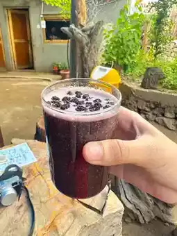 And India is a country that doesn't have any ice. I ordered a drink from a shop. Mulberry juice. What a pity! Anyone who has eaten mulberry can imagine the smell. And here, they blend it to make juice. What do you think I'll look like after drinking it? Oh my gosh. Both the smell and the water. Blend it together and there's no ice. Hmm...🤢🤮