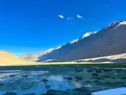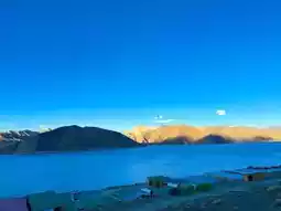 It's India beyond expectations. It's like being in Georgia, with sweeping meadows, mountains, and a turquoise lake so clear it's almost drinkable. This view reminds us of places other than India. I'd expected India to be hot, but not here. Leh Ladakh has beautiful weather year-round. The weather is especially chilly at night, sometimes reaching below freezing.