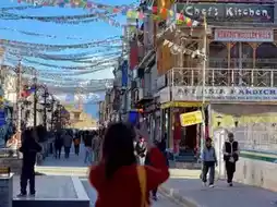 Leh market, a walking street market in Leh, has a lot of clothes, restaurants, and things to sell. You can walk around and relax. The atmosphere is nice. You can see the tall mountains in the background.