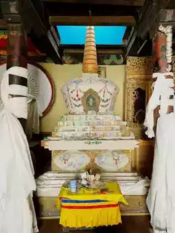 Inside, a golden Maitreya Buddha statue over three meters tall and colorful thangkas (Buddhist paintings) are enshrined, creating a solemn atmosphere.