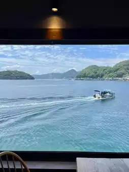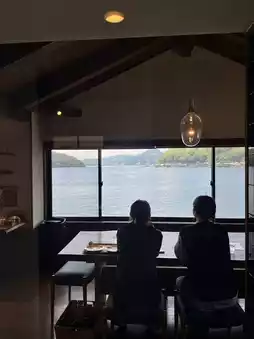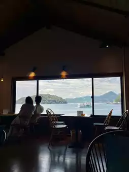 Housed in a two-story wooden building, the cafe features large windows that offer a panoramic view of the sea and the village of Ine no Funaya.