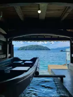 As the sun sets behind the mountains, the boat houses light up one by one, their warm glow reflecting on the water like stars fallen to earth.✨ The night breeze gently brushes by, and the waves whisper softly, as if time itself is tenderly held back by the tide.