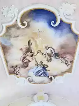 The chapel is built in the early Baroque architectural style, and the interior consists of a chancel with an altar, prayer stalls, and a nave with a painted ceiling. The ceiling is painted with images of the Virgin Mary and Christ, creating a majestic atmosphere.