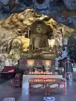 Upon arrival at Perak Cave, a colossal Buddha statue towering above the cave entrance and a red-roofed temple building nestled into the cliff face create a fairy-like scene. Entering the cave, a refreshing breeze greets you. The rock walls are engraved with Buddhist scriptures and colorful murals. Numerous Buddha statues are enshrined within the cave, creating a solemn and tranquil atmosphere.