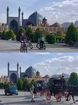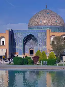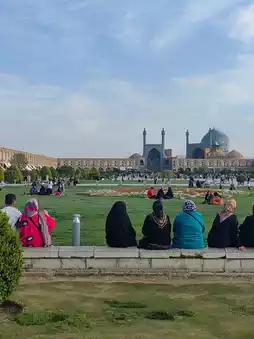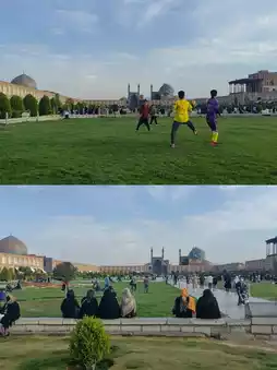 The attractions in Esfahan are mainly around Imam Square. On a good weather day, the square's lawn is for children playing football and locals picnicking. To the south is the Imam Mosque, to the east is the Sheikh Lotfollah Mosque, to the west is the Ali Qapu Palace, to the north leads to the bazaar, the old square, and the Jameh Mosque, and to the northwest is the Chehel Sotoun Palace, all of which can be walked through.