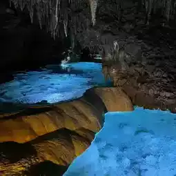 As I was walking, I suddenly heard the faint sound of flowing water in the distance. 💧 Following the sound, we discovered a clean, blue underground lake deep in the cave.