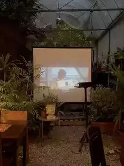 Adding to the charm is the friendly resident cat that roams the space, giving the place a cozy, homey vibe that makes you feel instantly welcome. Plus, there’s a projector at the front where movie screenings add a fun, communal touch to the dining experience, especially in the evenings.