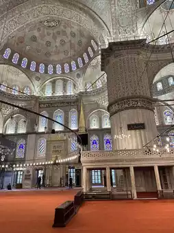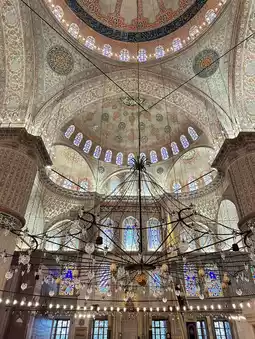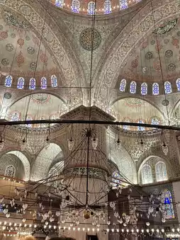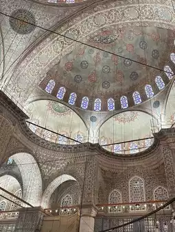 At first glance, it may seem more pink than blue, but the subtle blue patterns covering the interior walls, ceiling, and pillars give it the nickname "Blue Mosque." 💙