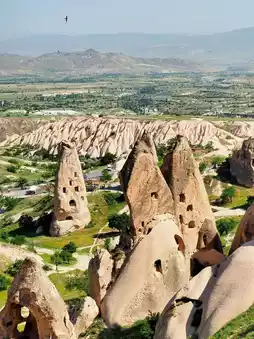 📍Take a hot air balloon overlooking the magical landscape of Cappadocia, visit the ancient Uchisa Fortress, visit the Goreme Open Air Museum, and walk in the Valley of Love to feel the uncanny workmanship of nature.