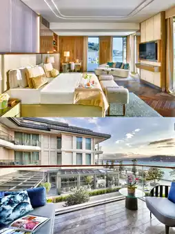 The hotel's design blends traditional Ottoman aesthetics with modern elements, featuring spacious terraces or balconies that showcase breathtaking views of the Bosphorus Strait. With 100 lavishly designed, spacious rooms and suites, guests can enjoy panoramic vistas of the Bosphorus and the city skyline. The rooms are adorned in a stylish, minimalist beige palette, complemented by locally crafted handwoven rugs, creating a warm and inviting atmosphere that harmonizes with the azure sea outside. Standing on your private balcony, the breeze feels as if it carries a soul of its own.