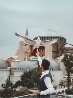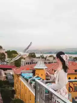 Go to the rooftop to feed the seagulls and take pictures of Istanbul two famous attractions 🩷 Up one side is the dining area, the other side is the photo area ~
