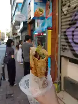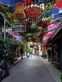 The small alleyways of Karaköy? Karaköy? had a truly lovely atmosphere. Colorful umbrellas filled the sky, and people gathered in small groups in cafes, enjoying a leisurely time. As evening approached, warm lights came on, making the alleys even more beautiful. I couldn't help but take a photo.